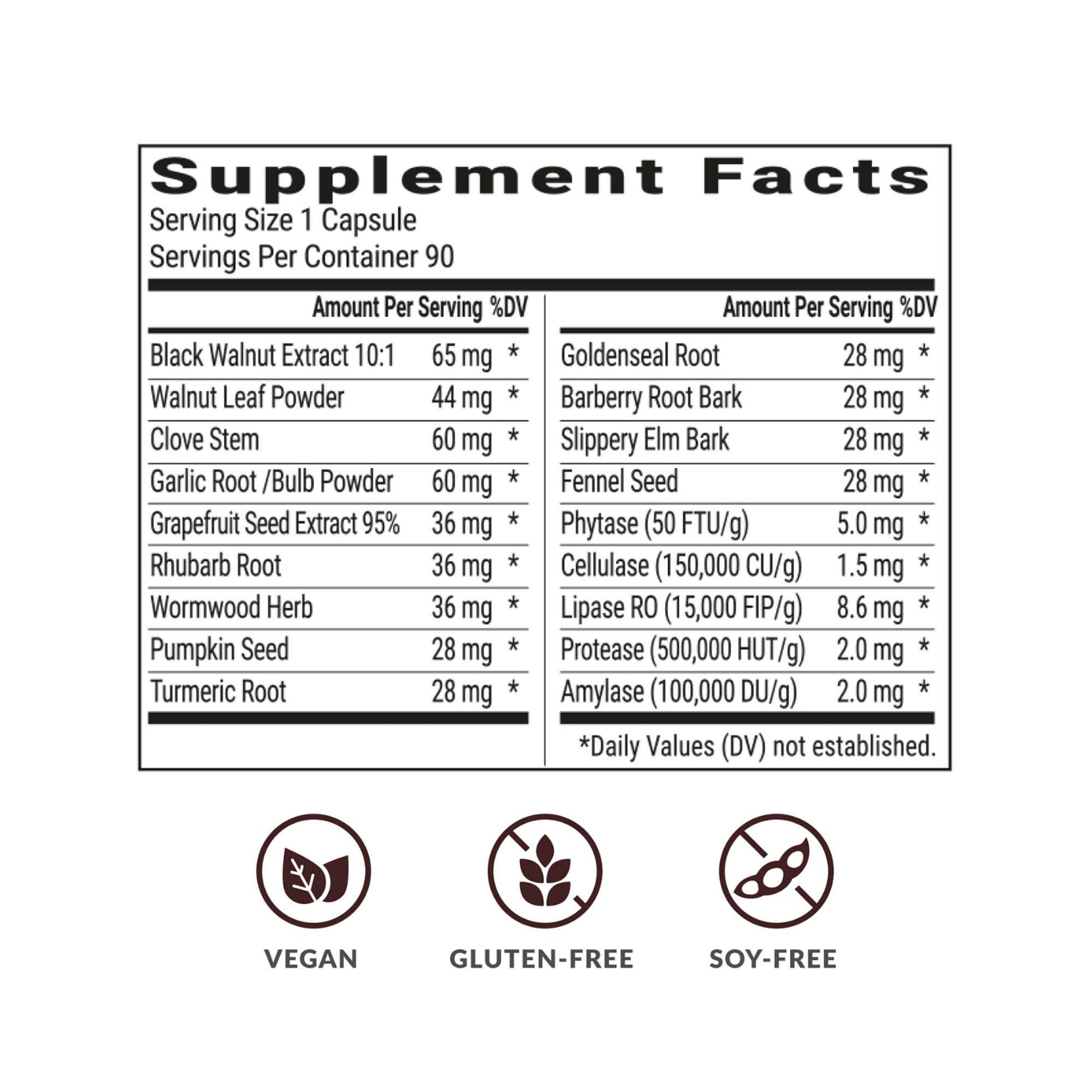 It combines a precise blend of 13 synergistic herbs with anti-parasitic, anti-fungal, and anti-bacterial properties, along with 5 digestive enzymes to support digestion and biofilm breakdown. This formula aims to kill parasites, fungi, and bad bacteria, making room for beneficial gut microbes. Additionally, ingredients like slippery elm and turmeric help soothe the gut lining and promote a balanced inflammatory response.