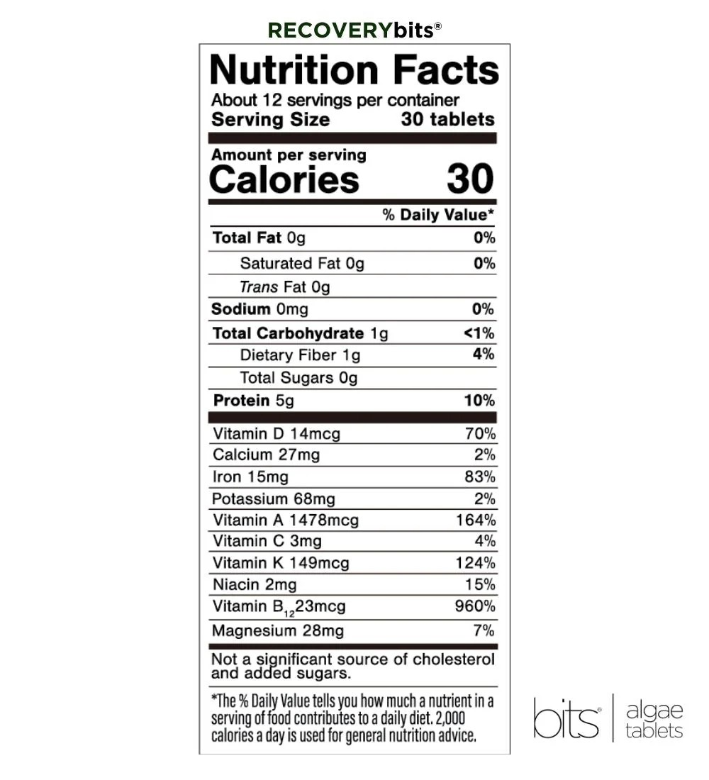 Bits RECOVERYbits, your go-to wellness companion offering 100% pure chlorella tablets designed to naturally detoxify, support muscle recovery, and boost overall health. These tablets are an energy-boosting, immune-enhancing superfood rich in protein, vitamins, and minerals. Each tablet is packed with over 40 essential nutrients, including vitamins A, C, B-complex, and minerals such as iron and zinc, making it a powerful addition to your daily health routine.