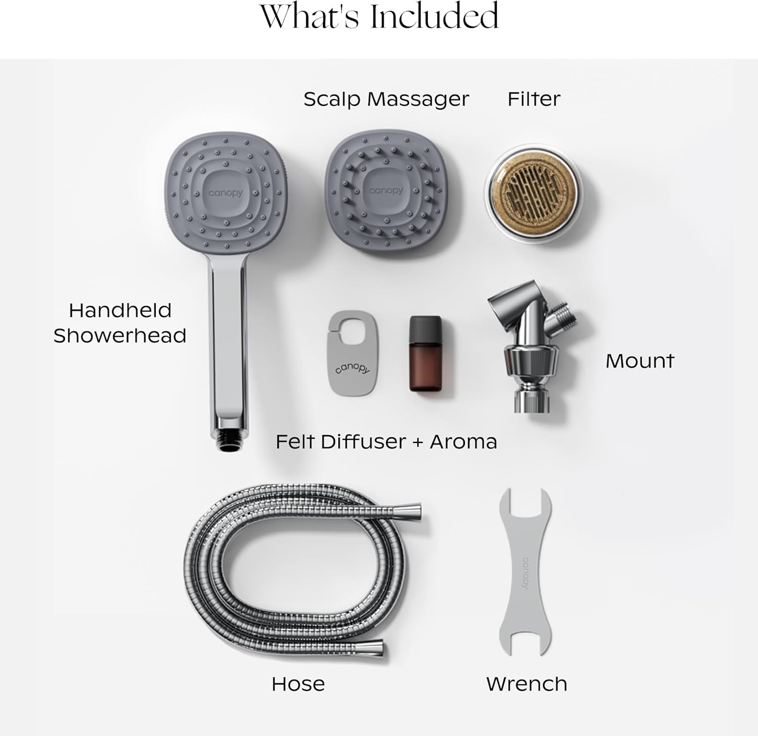 Wellness and Relaxation: enhance your daily routine with the Canopy brand's signature aromas and felt diffuser. Whether you're starting your day or winding down at night, this showerhead promises a relaxing and de-stressing experience.