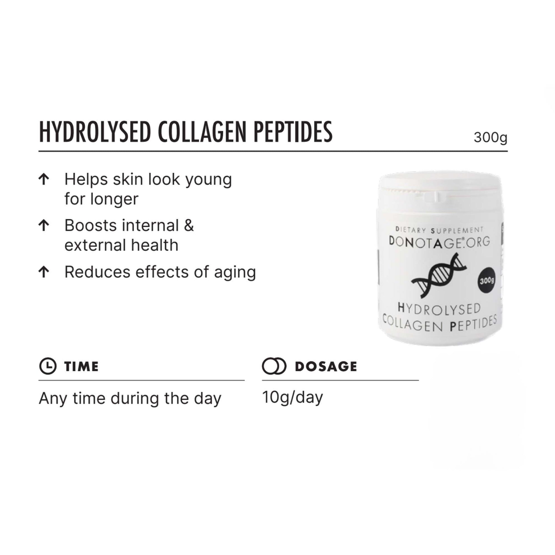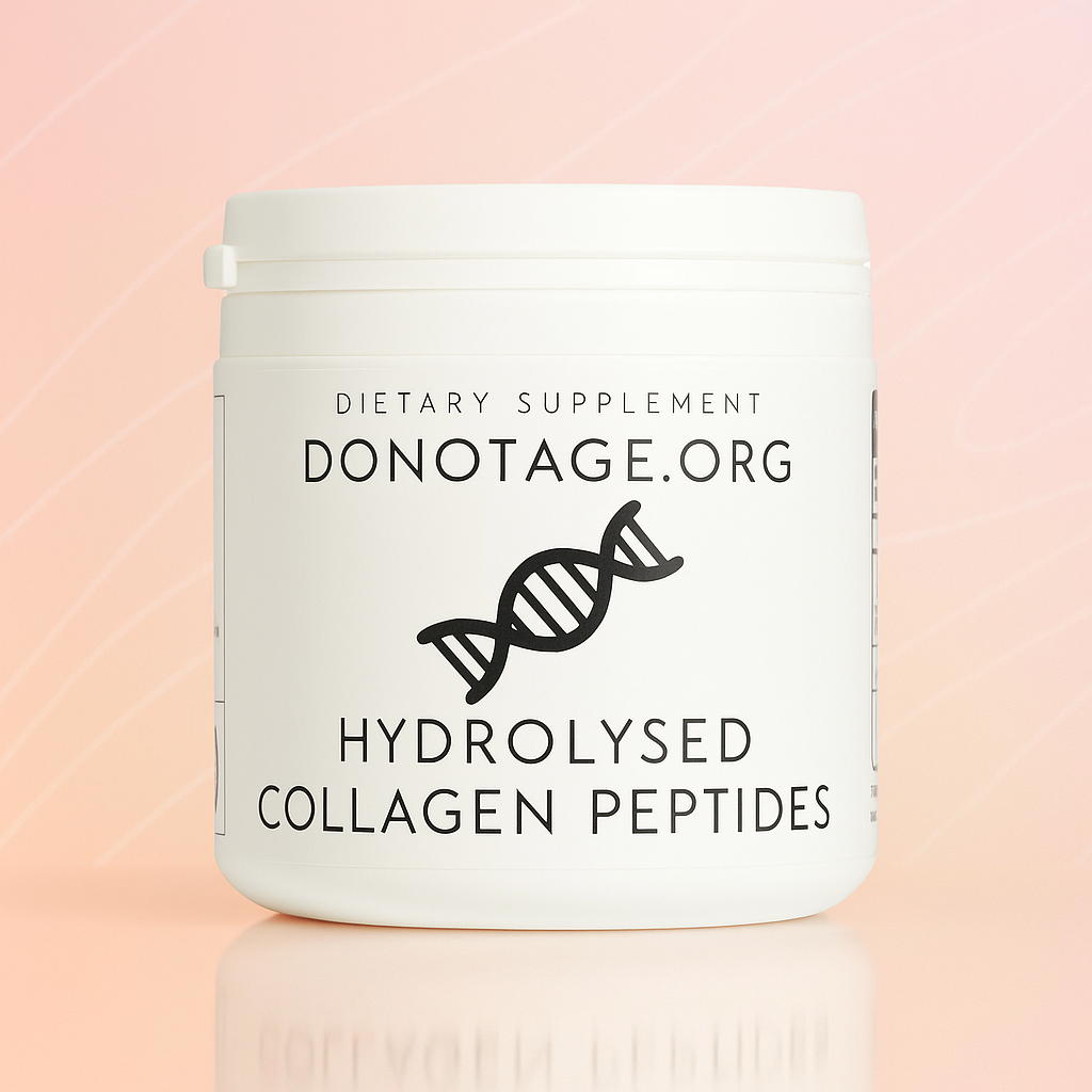 Collagen is the main structural protein in the body's connective tissues, accounting for 25% to 35% of total protein content. As we age, our body's natural collagen production declines, leading to signs of aging such as wrinkles and decreased skin elasticity. DoNotAge's Hydrolysed Collagen Peptides provide a high-quality, unflavoured collagen supplement sourced from grass-fed cows.