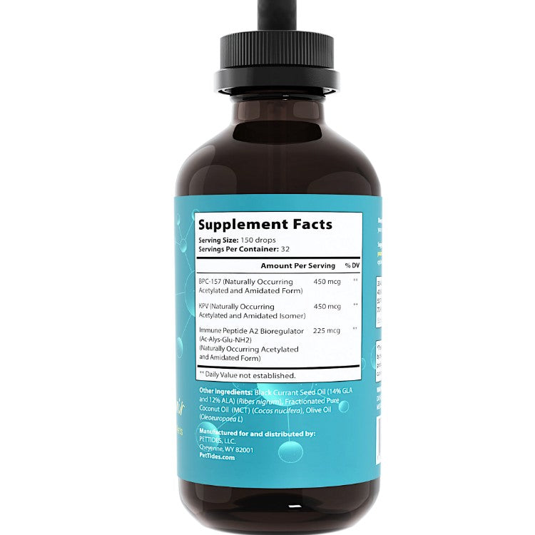 Peptide-infused oil represents this innovation, offering a specially formulated blend of potent peptides in an 8oz bottle for large pets. This premium oil features BPC-157, Immune Peptide A2, and KPV (Lysine-Proline-Valine), each selected for their unique properties.