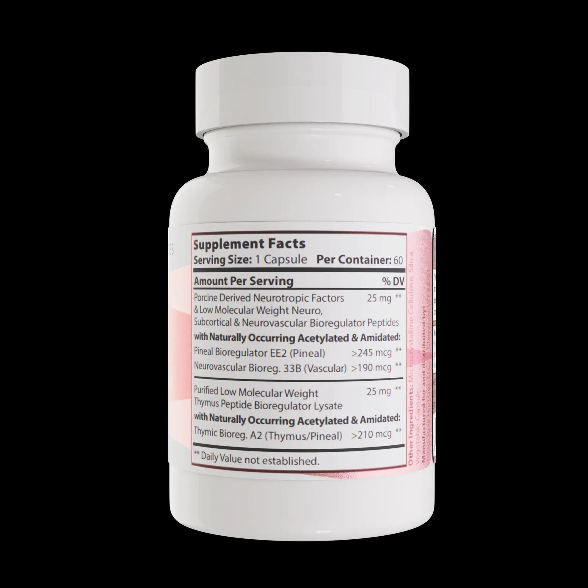 PinealPep is an advanced supplement formulated to support brain health, balanced nervous system function, and vascular integrity. Combining porcine-derived neurotropic factors and low molecular weight bioregulator peptides, this innovative formula offers targeted support for pineal and subcortical brain health, neurovascular function, and cognitive clarity.