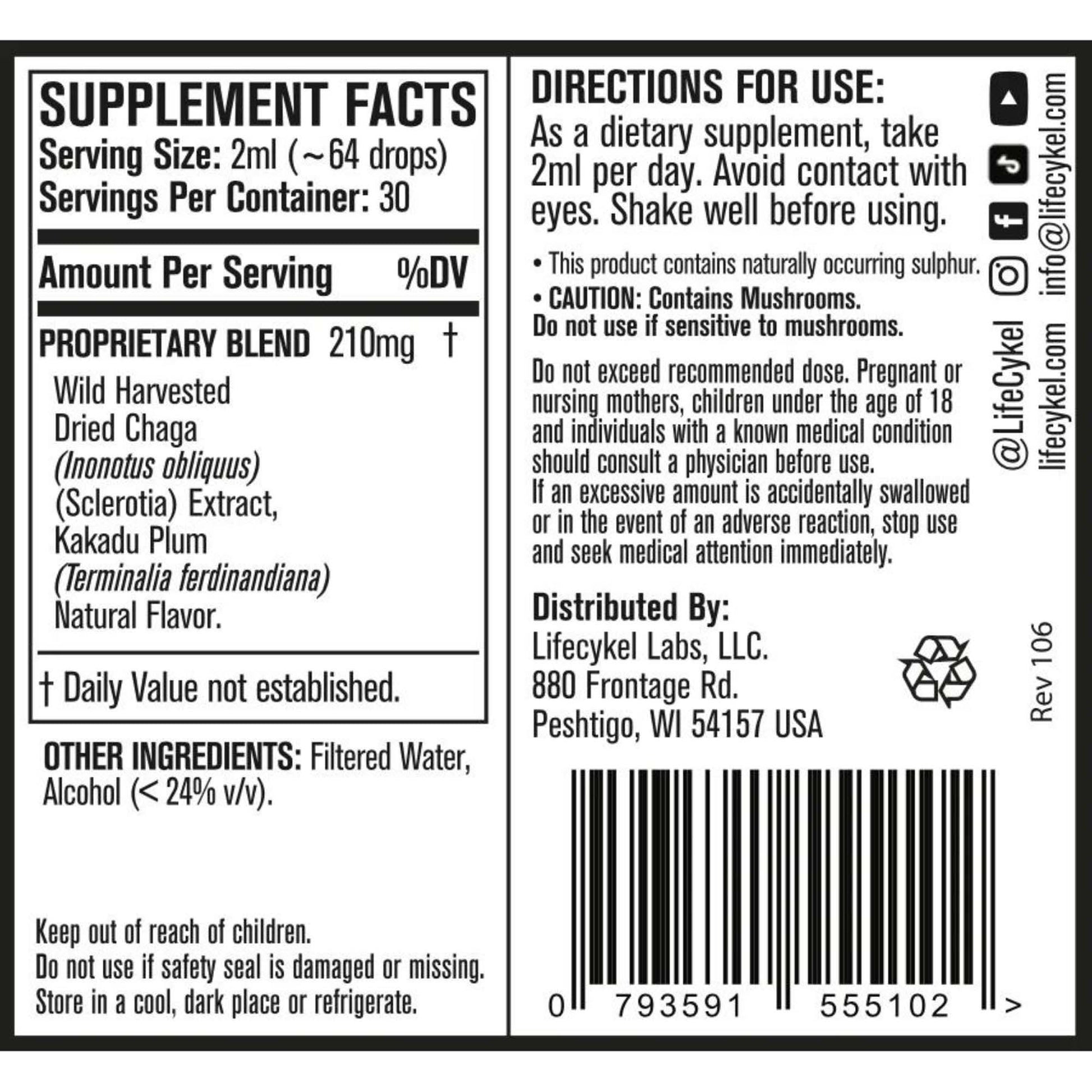 Elevate your wellness with Lifecykel Labs Chaga Double Extract, and experience the benefits of nature\'s most powerful antioxidants every day. Made in USA.2 fl.oz / 60 ml.