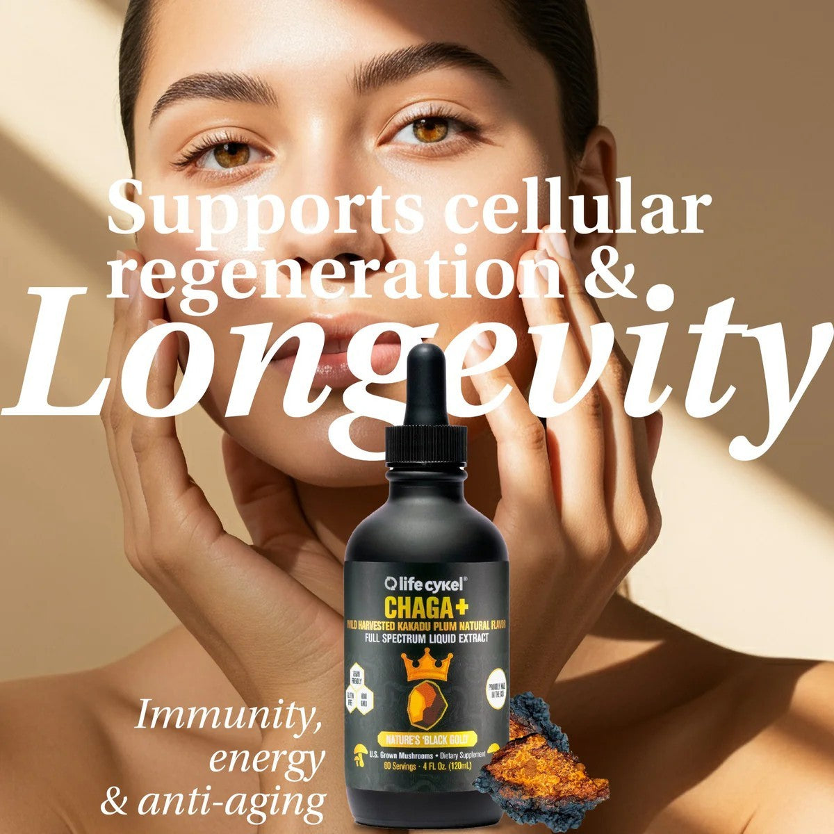Lifecykel Labs Chaga Double Extract offers a powerful blend of organic Chaga mushrooms and Kakadu Plum, renowned for their exceptional health benefits. This tincture is packed with antioxidants such as inotodiol and betulin, which are essential for supporting cellular health and promoting overall wellness and vitality.
