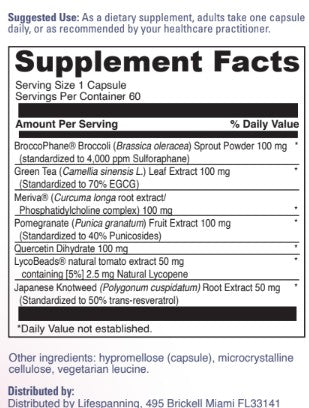 MetaBoost™ combines botanicals like broccoli sprout (100 mg, 4000 ppm sulforaphane), green tea (70% EGCG), Meriva® curcumin, pomegranate, quercetin, lycopene, and resveratrol to support detox, metabolism, and immunity.