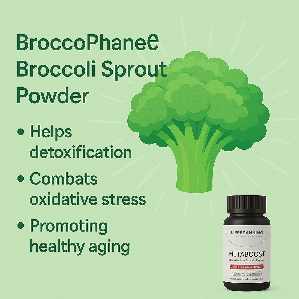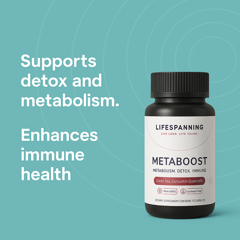 LIFESPANNING MetaBoost is your go-to solution for enhancing overall health and well-being. This carefully formulated supplement combines extracts from powerful botanicals known for their natural efficacy in promoting longevity and health. Each capsule is a blend of BroccoPhaneuae Broccoli Sprout Powder, Green Tea Extract, Merivaae Curcumin, and more, all chosen for their proven benefits in supporting detoxification, metabolism, and immune health.
