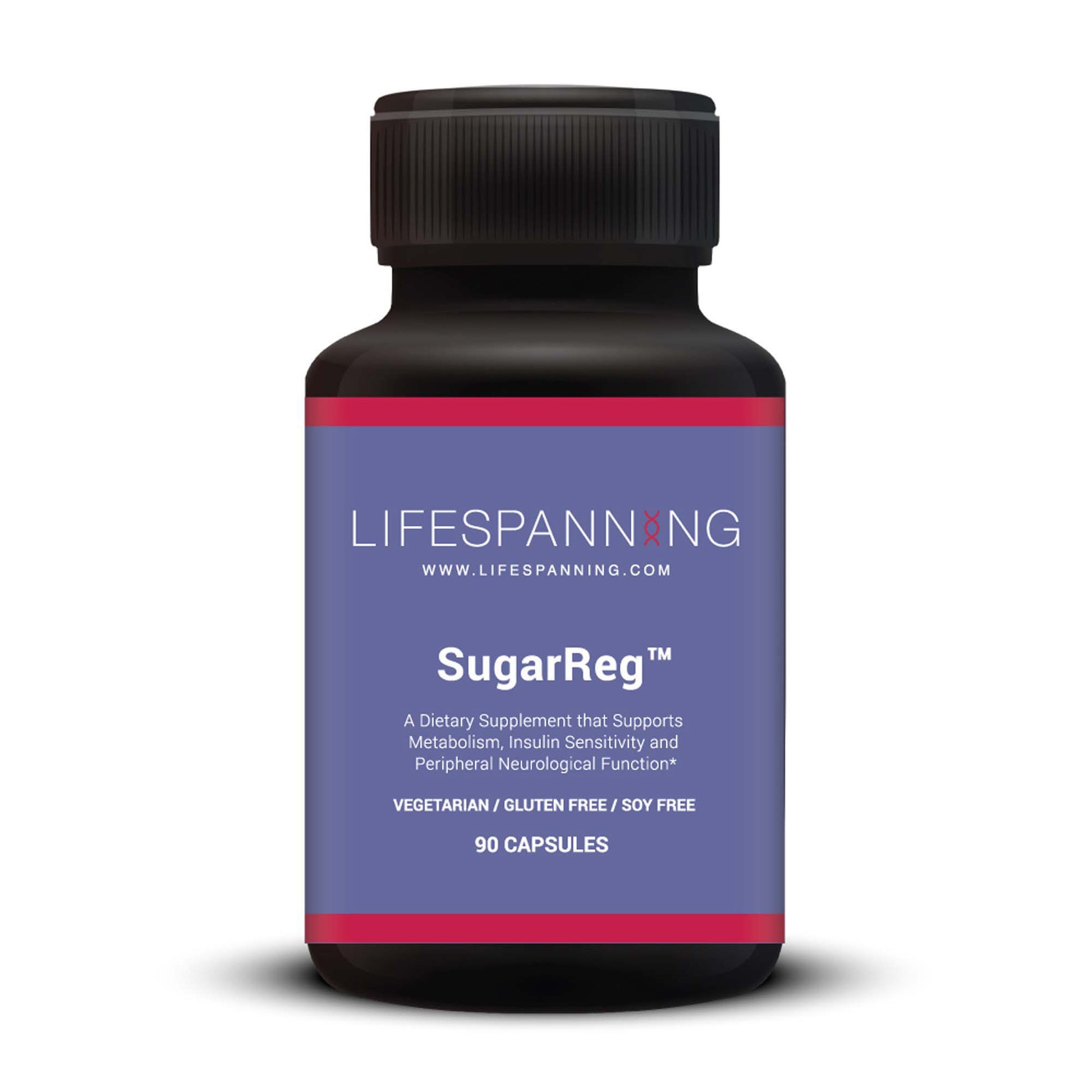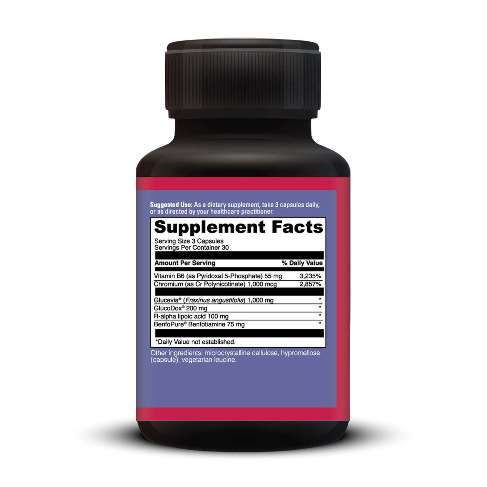 SugarReg™ combines B6 (55 mg), chromium (1,000 mcg), Glucevia® (1,000 mg), GlucoDox® (200 mg), R-alpha lipoic acid (100 mg), and BenfoPure® (75 mg) to support glucose levels, insulin sensitivity, and nerve health.