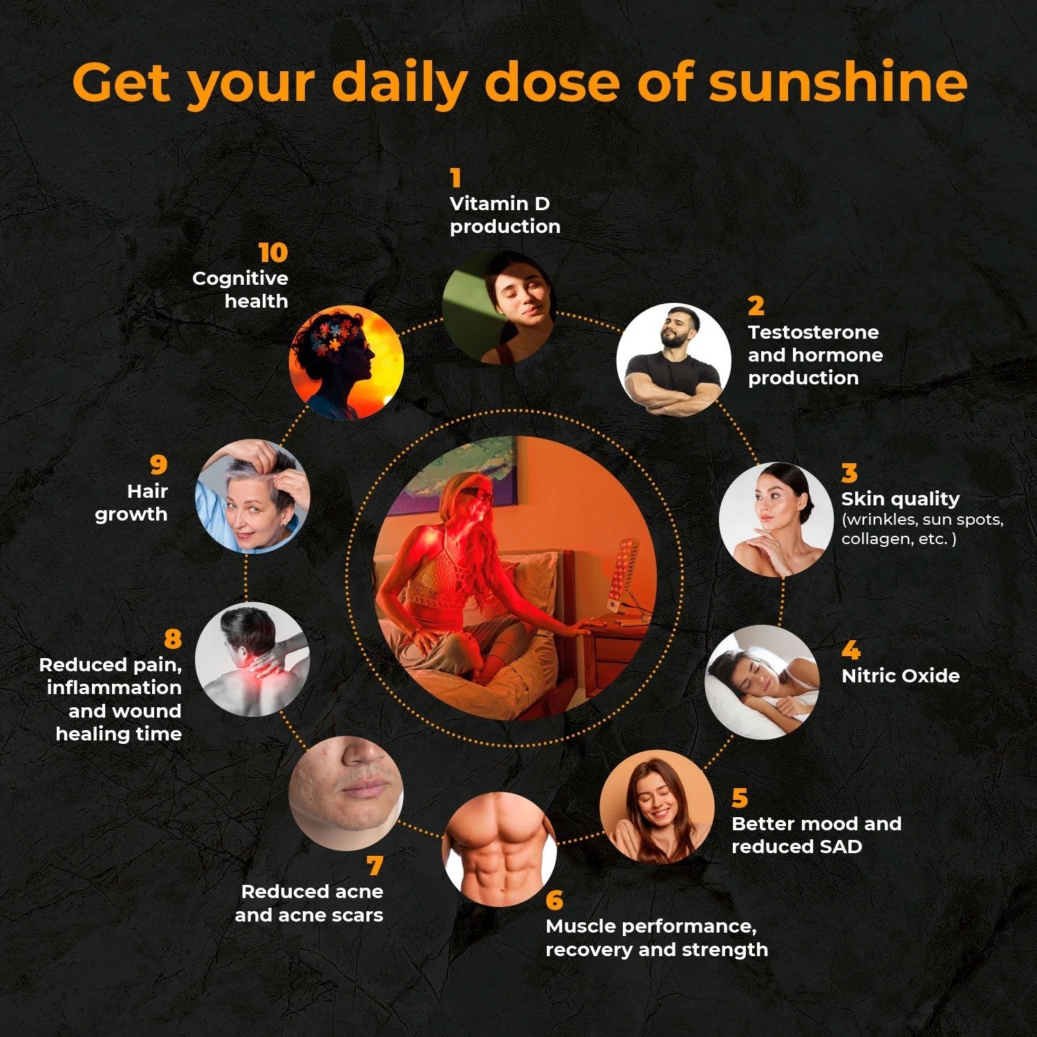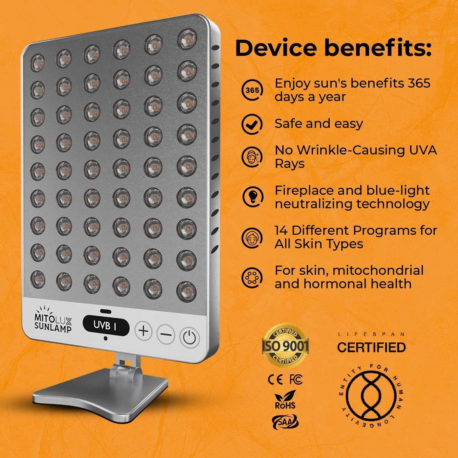 This innovative device combines safe UVB exposure with Red, Deep Red, and NIR light, mimicking the essential components of sunlight.