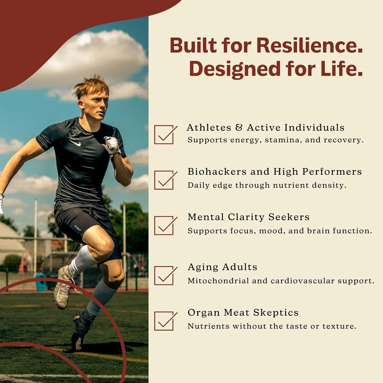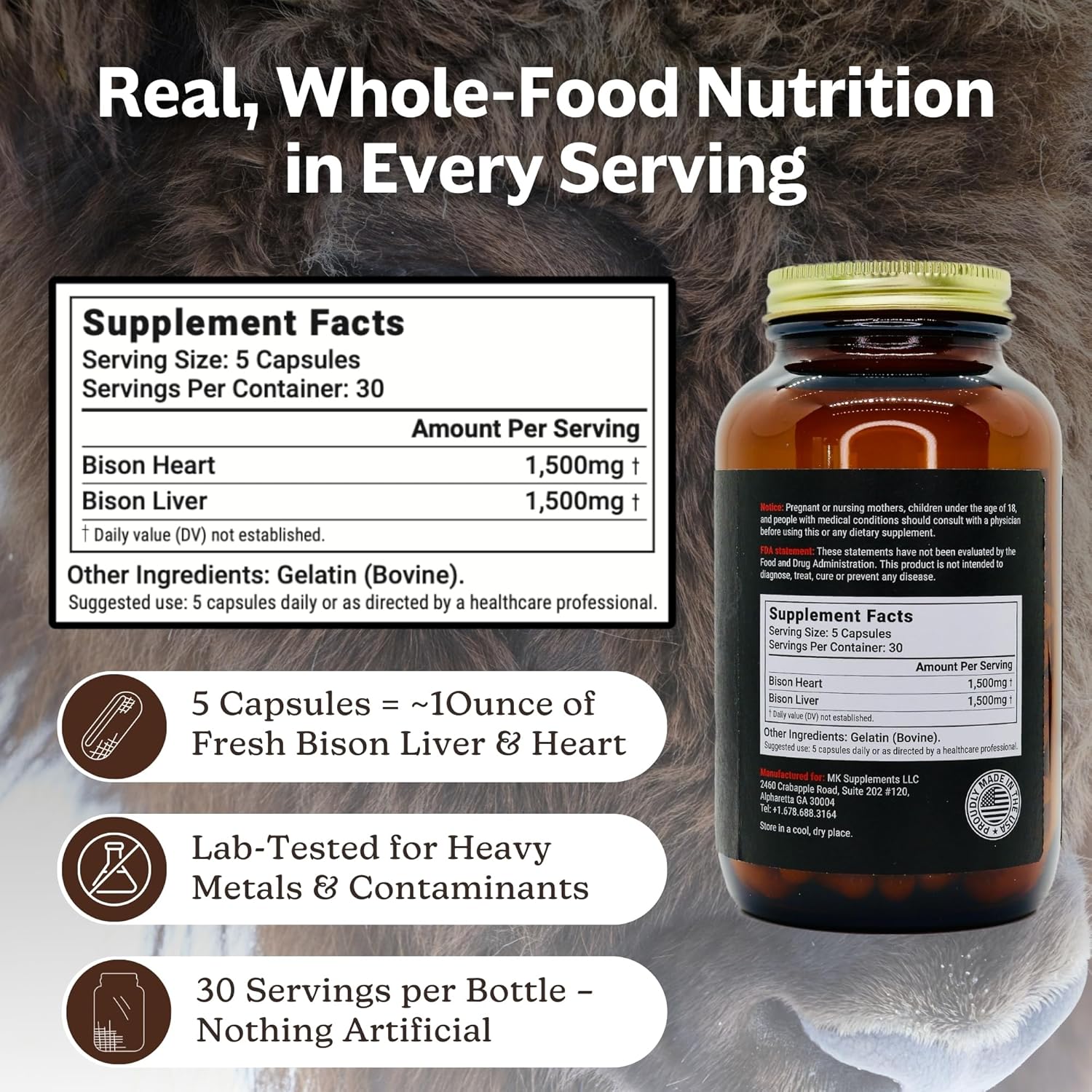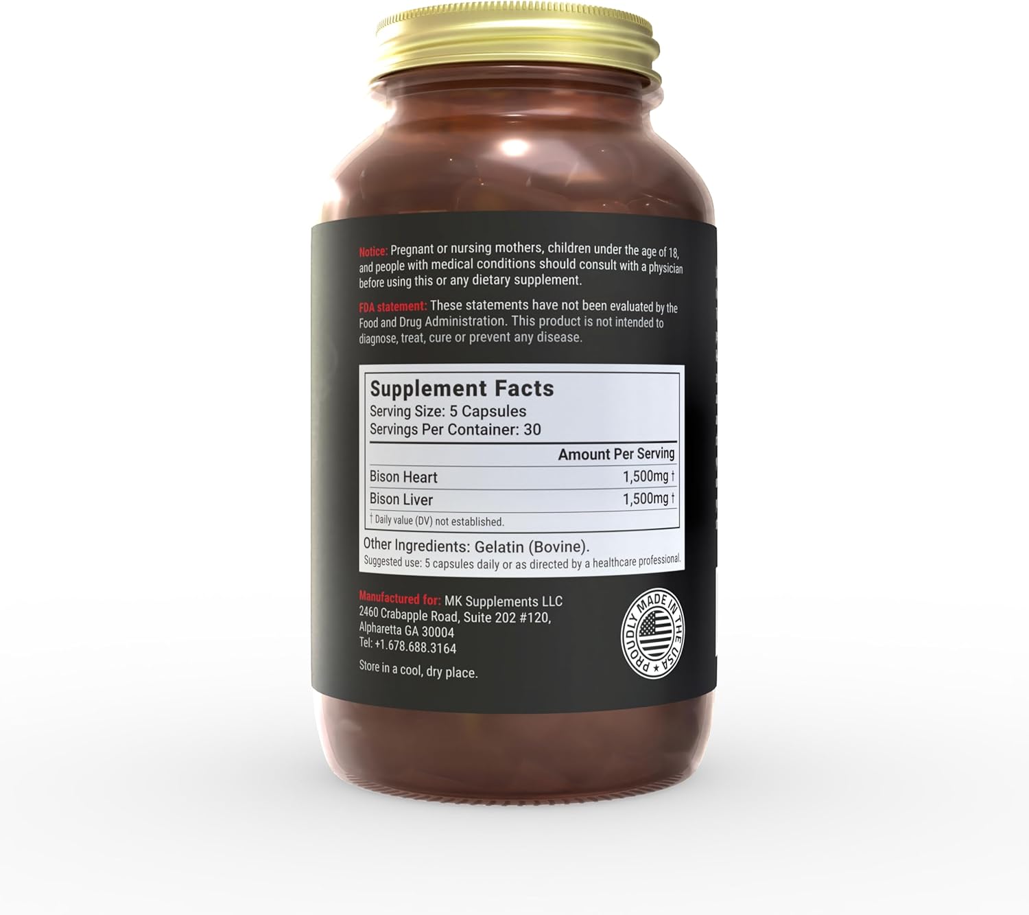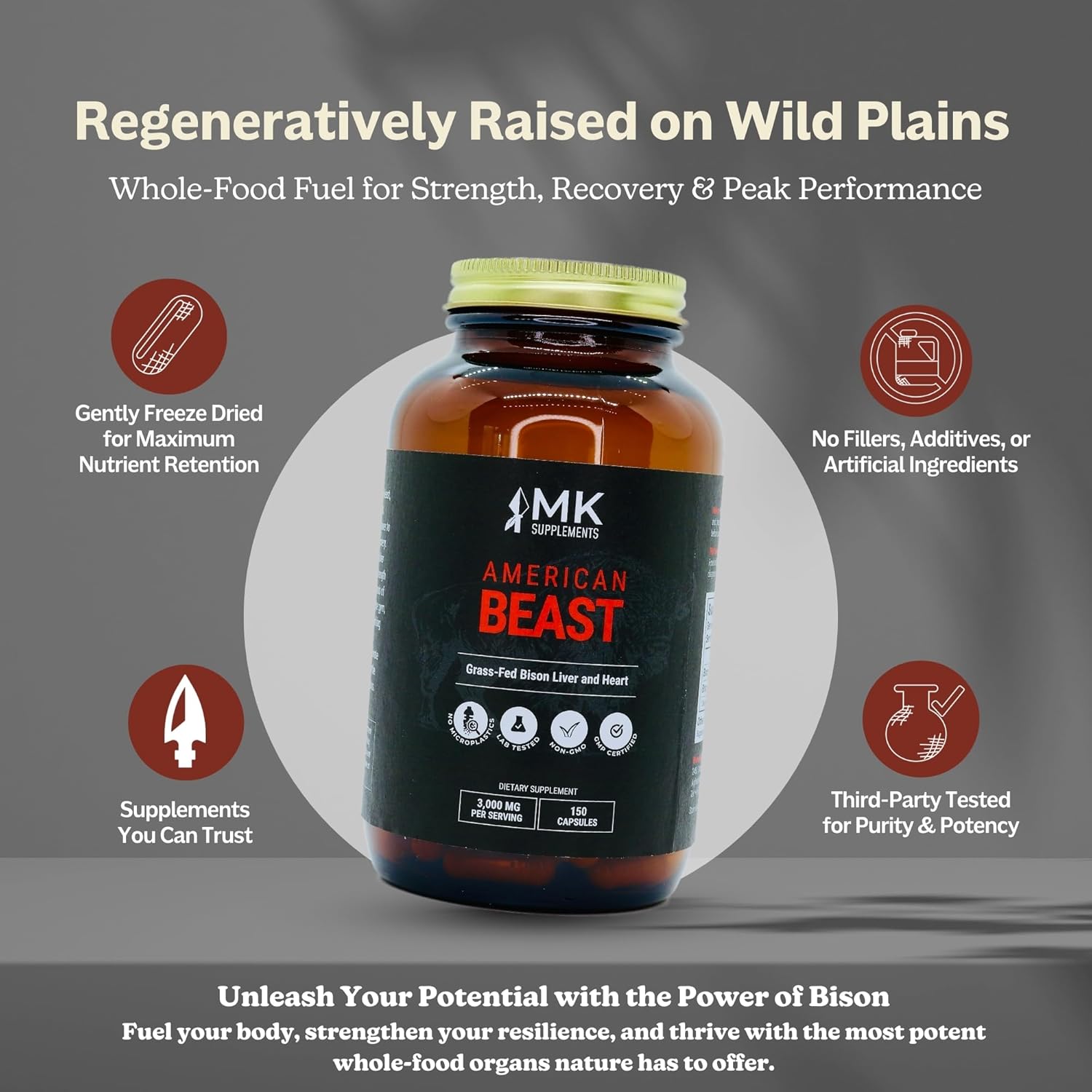 American Beast, a dynamic supplement designed to maximize your strength, endurance, and recovery. Our potent formulation includes grass-fed bison liver and heart, providing a rich source of B vitamins, zinc, iron, and essential electrolytes. These nutrients work together to fuel your body, enhance stamina, and accelerate recovery for peak performance.