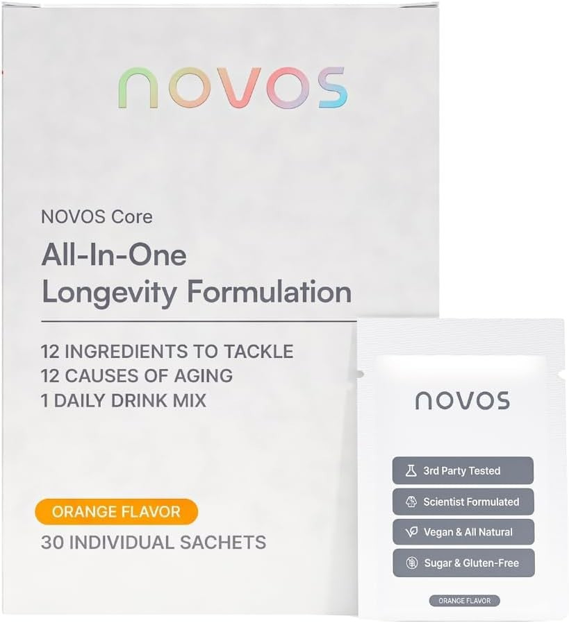 Each serving of this orange-flavored supplement combines 12 scientifically studied ingredients targeting the fundamental biological processes of aging. Packed with skin-enhancing components like hyaluronic acid and collagen-boosting alpha-ketoglutarate, NOVOS Core promotes hydration and reduces wrinkles. Unique blend also features energy and cognition enhancing compounds, helping to maintain optimal brain function and mood stability. Made with nature-based ingredients such as vitamin C, ginger, and glycine, this mix ensures optimal dosages for effective aging support. Free from calories, sugar, gluten, and animal products, NOVOS Core is an all-natural, vegan, and USA-manufactured choice for those wishing to embrace the golden years with vitality.