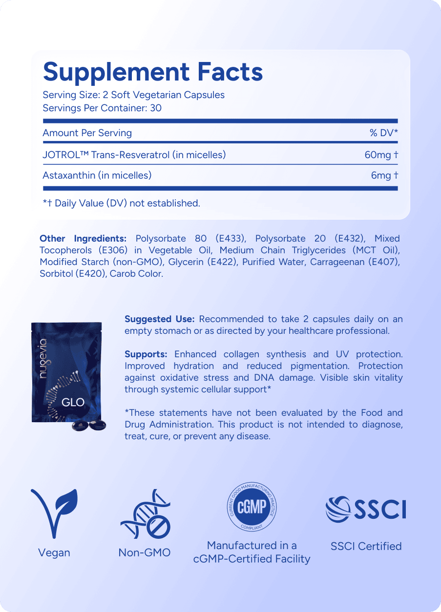 GLO enhances skin vitality through advanced resveratrol and antioxidant synergy.