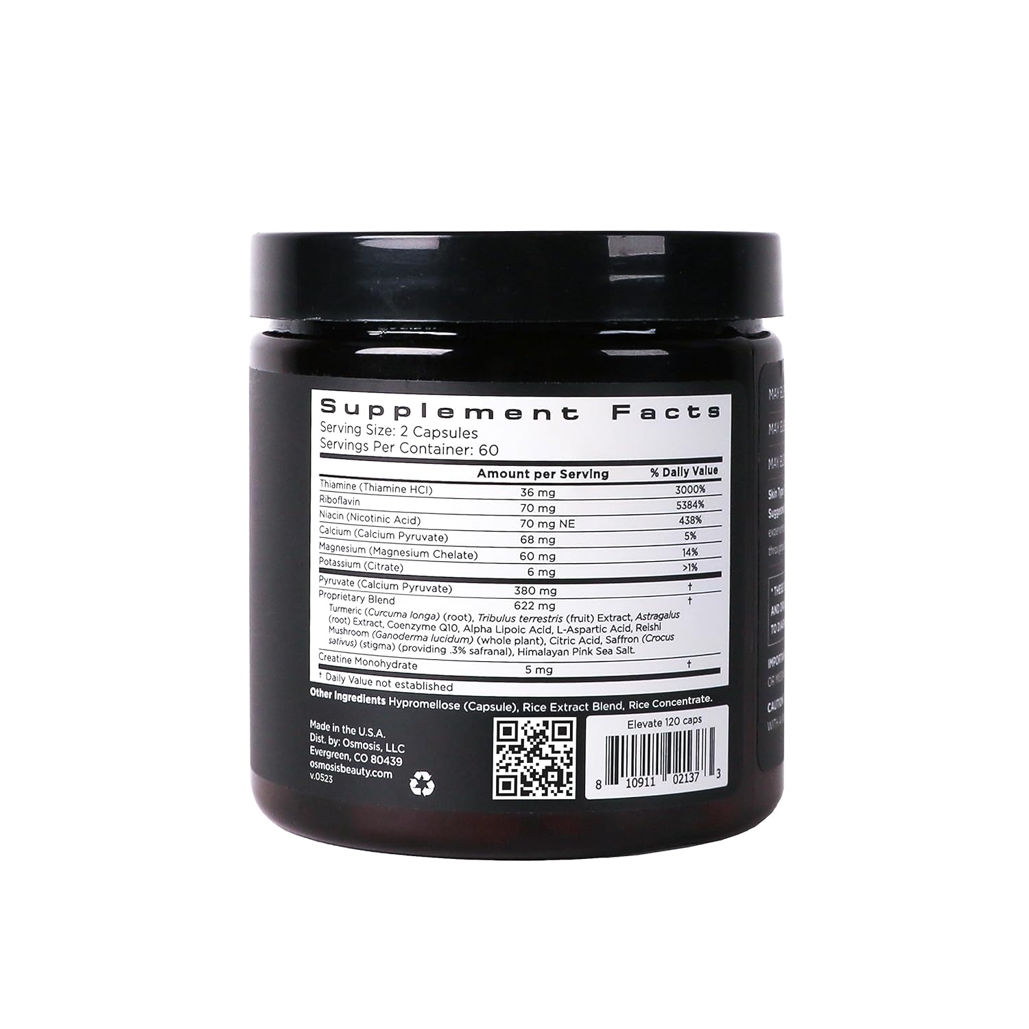 Elevate provides the components for ATP production. ATP (Adenosine Triphosphate) is a powerful tool for healthy skin, brain, muscle, and other activity. It aids in collagen production, which is essential for skin elasticity and joint health.