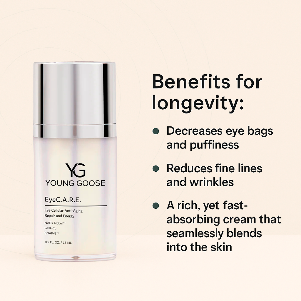 EyeC.A.R.E. (with NAD+ Precursors) NAD+ Boosting Eye Cream is a highly concentrated formula designed to rejuvenate the delicate eye area. It effectively reduces the appearance of fine lines, wrinkles, bags, and puffiness, with visible results in as little as ten minutes.